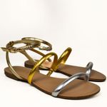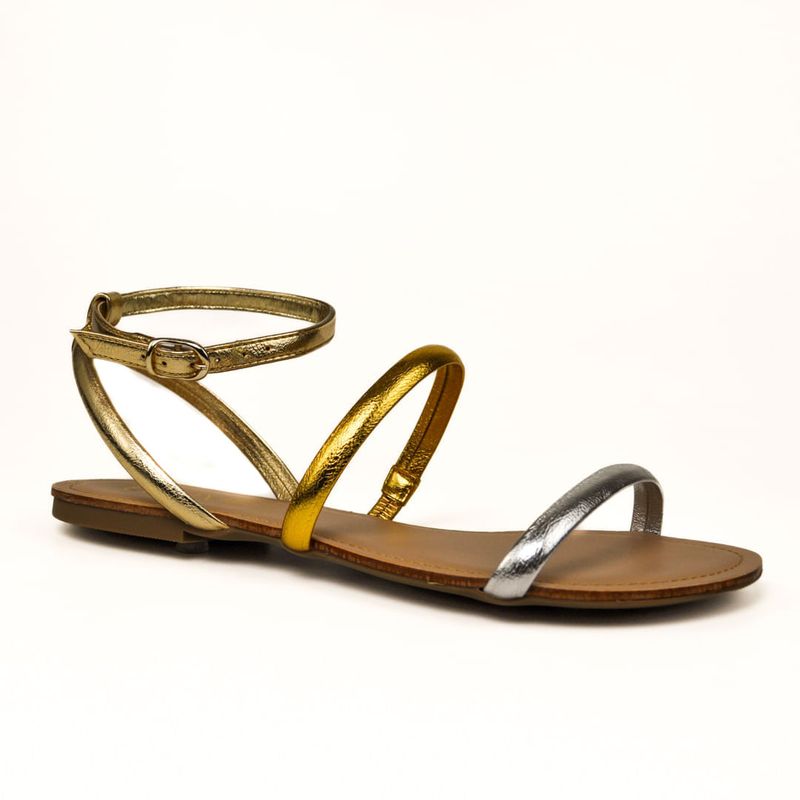 Elegante e versátil! A Rasteira Ponta Verde Prata e Ouro light combina tiras metalizadas em prata, dourado e verde claro, com fechamento no tornozelo e solado plano confortável.