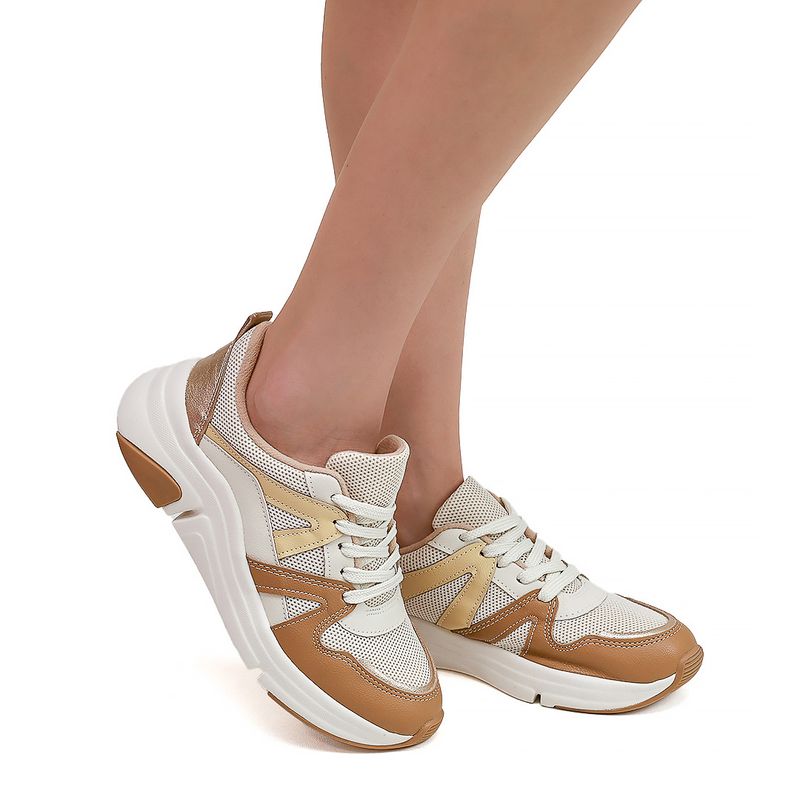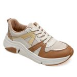 Conforto, estilo e versatilidade em um só calçado! O tênis casual Dumont feminino une o design moderno do solado robusto com uma combinação elegante de tons bege, caramelo e dourado, ideal para quem busca destacar o look com personalidade.