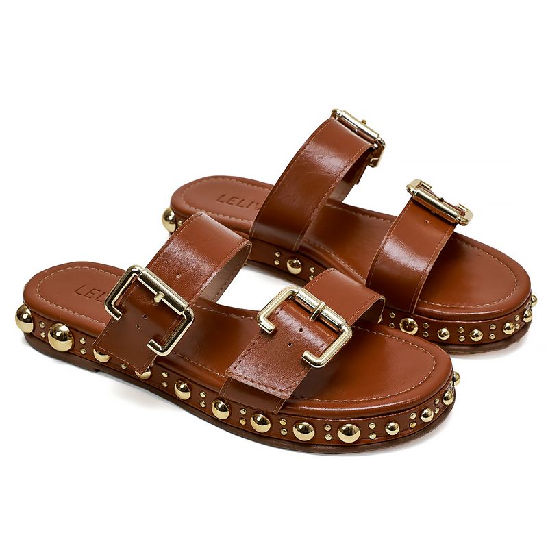 Flatform Martin com design moderno e cheio de atitude. Confeccionada em material sintético de alta qualidade, apresenta duas tiras largas com fivelas metálicas douradas ajustáveis, garantindo praticidade e conforto ao calçar. O destaque fica por conta das aplicações de tachas douradas ao redor do solado, que trazem um toque de estilo e personalidade à peça. A palmilha macia oferece bem-estar durante o uso, ideal para quem busca unir conforto e moda.