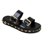 Flatform Martin com design moderno e cheio de atitude. Confeccionada em material sintético de alta qualidade, apresenta duas tiras largas com fivelas metálicas douradas ajustáveis, garantindo praticidade e conforto ao calçar. O destaque fica por conta das aplicações de tachas douradas ao redor do solado, que trazem um toque de estilo e personalidade à peça. A palmilha macia oferece bem-estar durante o uso, ideal para quem busca unir conforto e moda.