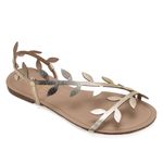 A delicadeza da natureza inspira o visual desta rasteira, que traz tiras em formato de folhas para um toque romântico e moderno. Leve e confortável, ela abraça o pé com suavidade e adiciona charme imediato a qualquer produção.