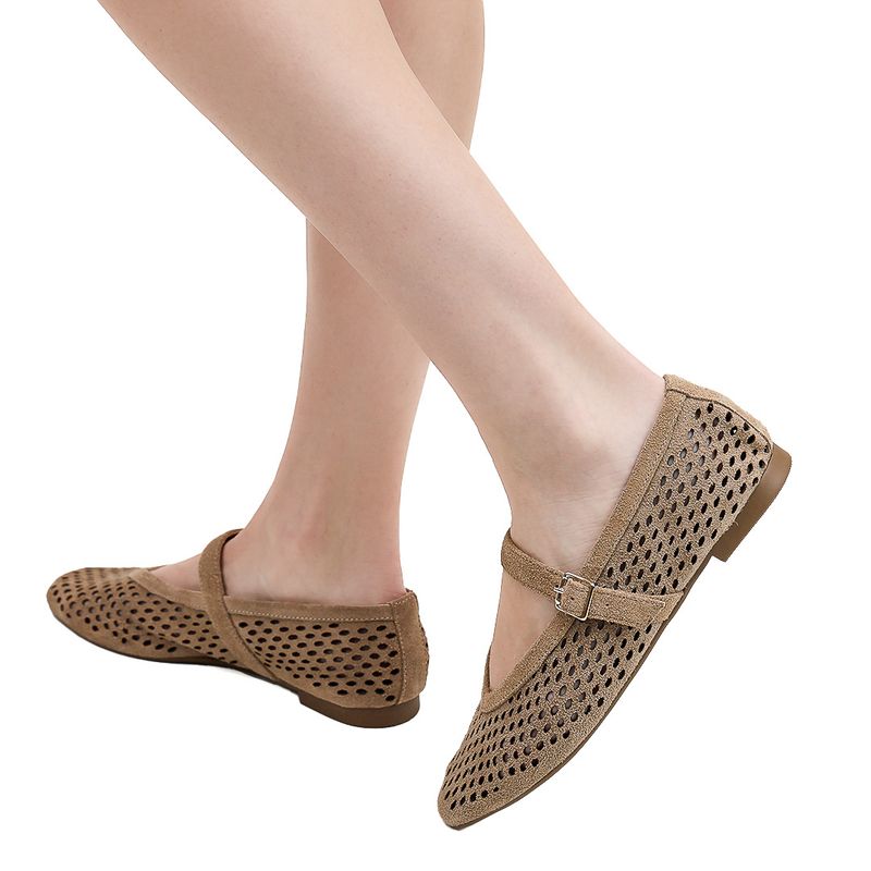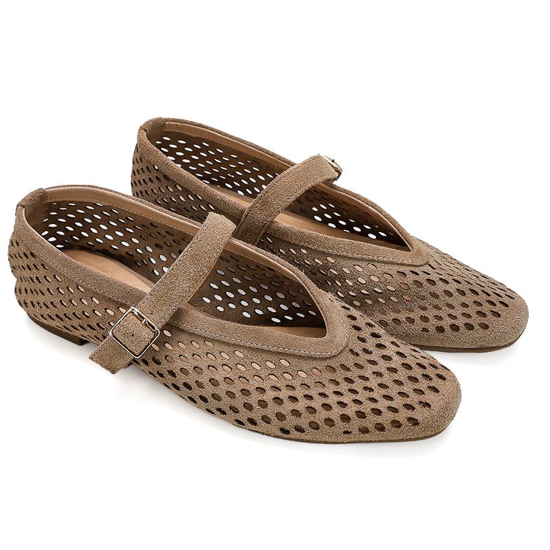 Com design vazado e acabamento em couro camurça na cor fendi, ela proporciona conforto térmico, flexibilidade e um toque artesanal contemporâneo. A tira delicada com fivela reforça a segurança sem comprometer a estética minimalista.